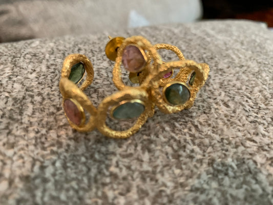 Aretes en oro laminado y plata. La mayoría son hechos a mano y uno de cada uno. Manejamos joyería de autor de diseñadores reconocidos. Los materiales son oro laminado 18k skillus así como plata y piedras semipreciosas.
