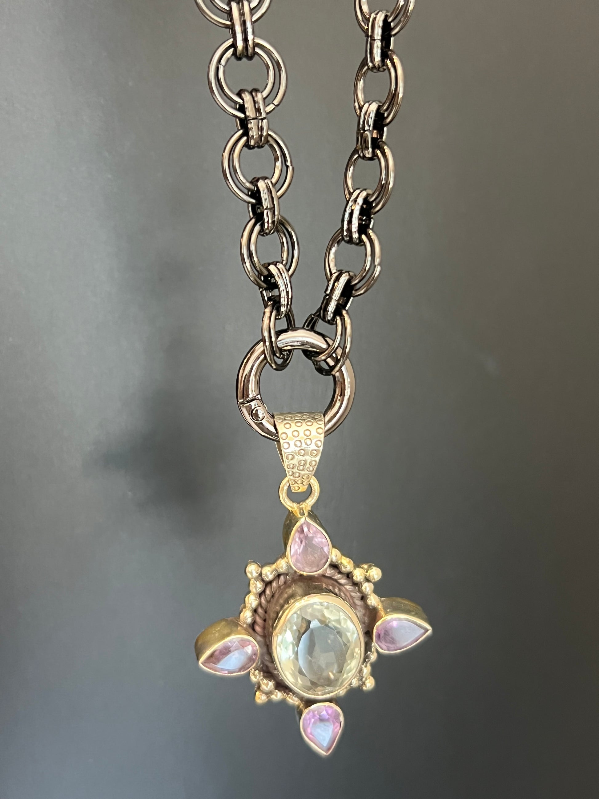 Cadena gruesa oscura gun metal, con dije en Plata .925 Amatista Natural y Aguamarina 45 cms aprox.